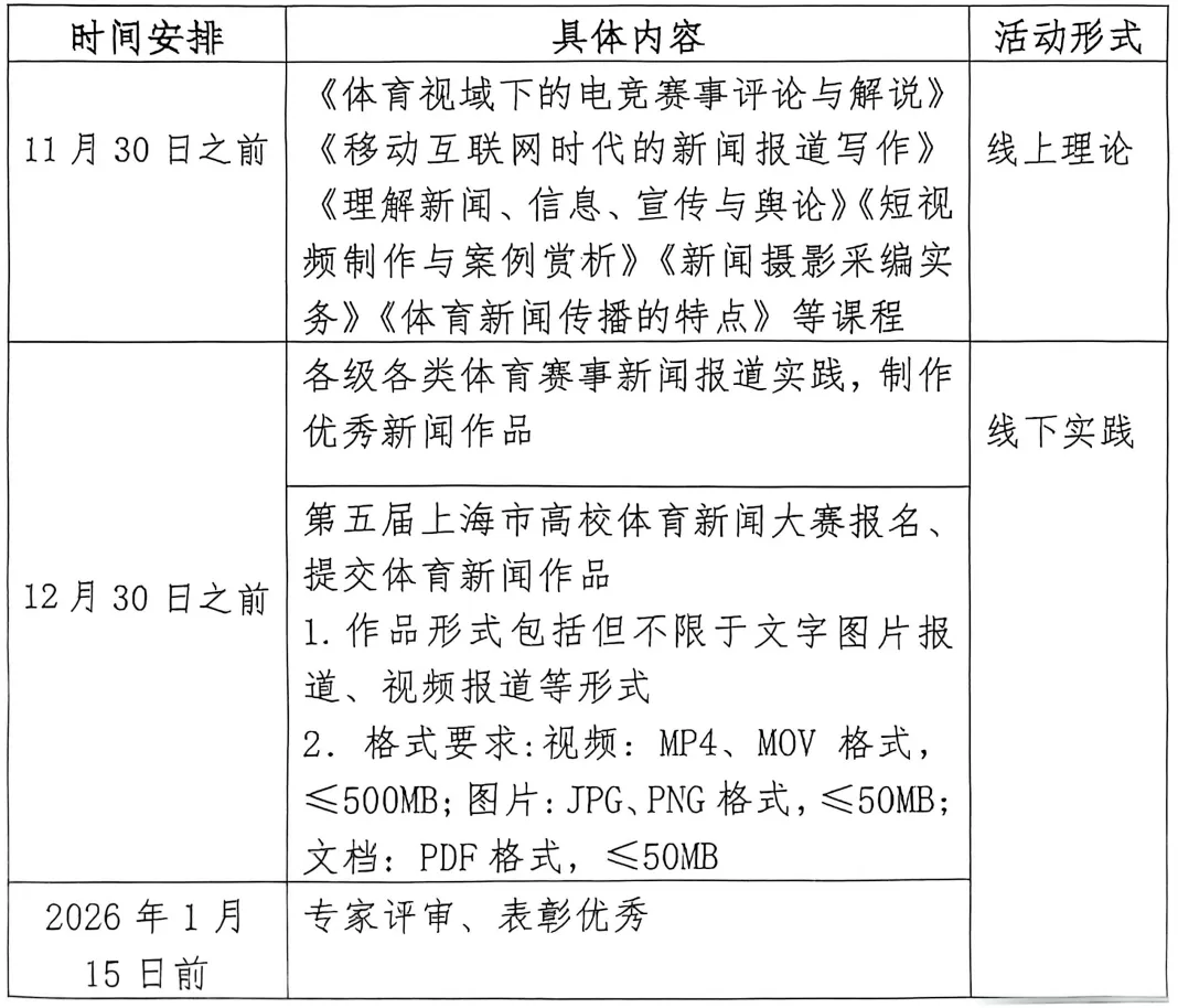 “阳光体育”大学生志愿者优培计划暨第五届上海市高校体育新闻大赛开班仪式、数字时代的体育新闻业务前沿相关线上理论课程、阳光体育新闻作品实践活动评比及交流、专家评审、颁奖及表彰等。