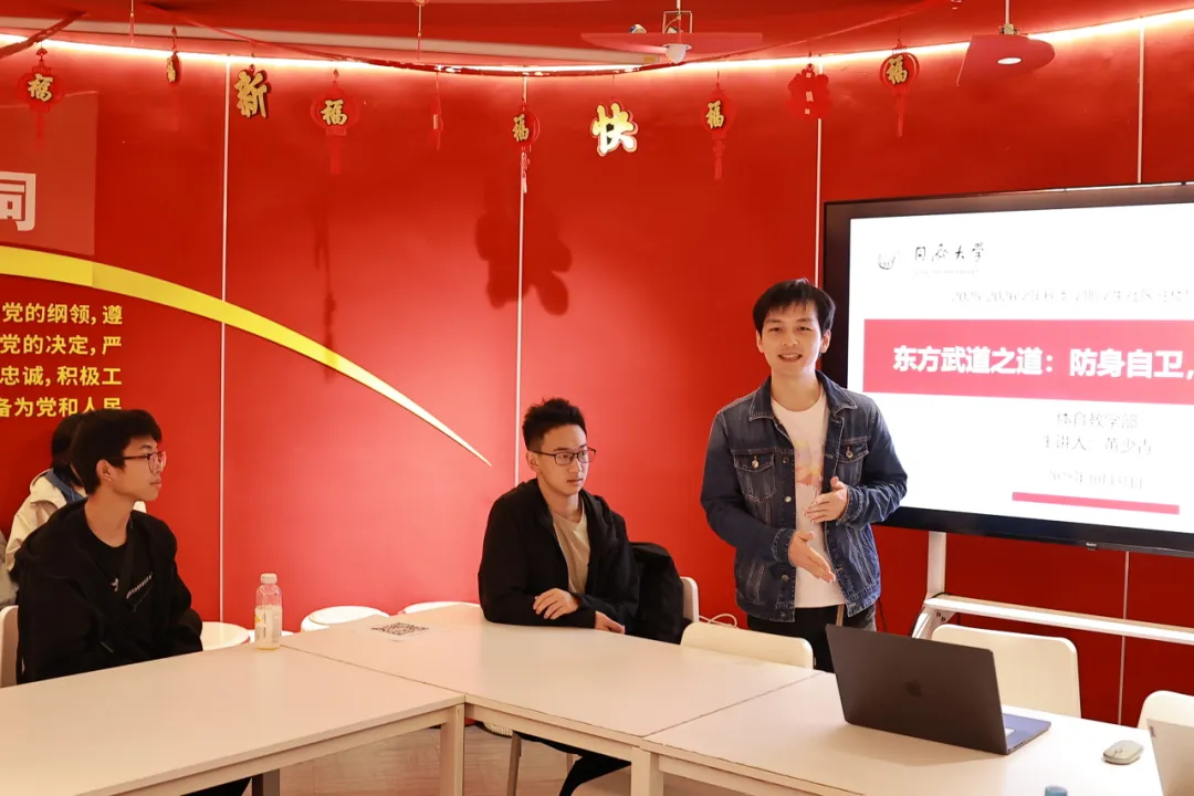 10月31日中午,体育教学部“驻楼导师工作站”活动在四平路校区西南八楼党建室顺利举行。体育教学部教师黄少青以“东方武道之道 —— 防身自卫,心技一体”为主题,向同学们进行东方武道精神文化分享和实用技能传递,三十余名同学参与活动。