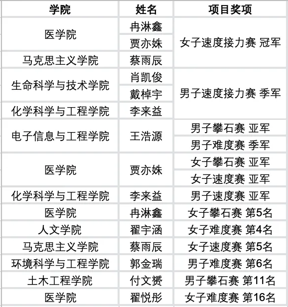 从团体接力的协同作战到个人单项的奋力拼搏,我校攀岩队全体队员在赛场上展现出顽强的竞技精神与积极的参赛态度。此次参赛所取得的优异成绩,是对我校攀岩队训练工作的充分肯定,也是“同舟共济,自强不息”的同济精神在体育赛场上的生动体现。期待我校攀岩队队员在后续赛事中持续突破,再创佳绩,为学校赢得更多荣誉!