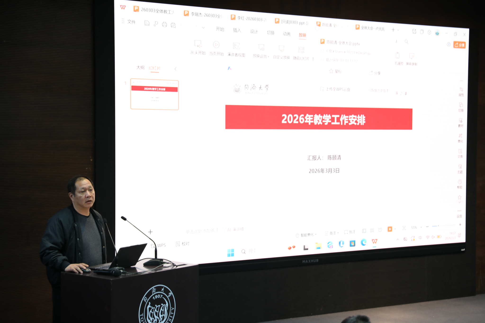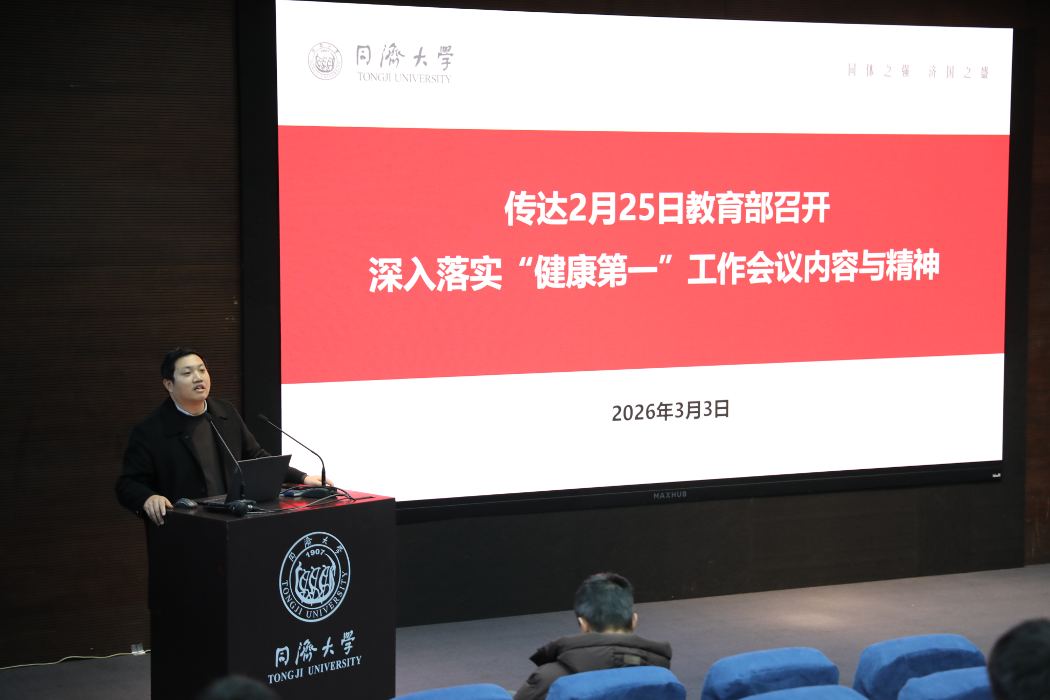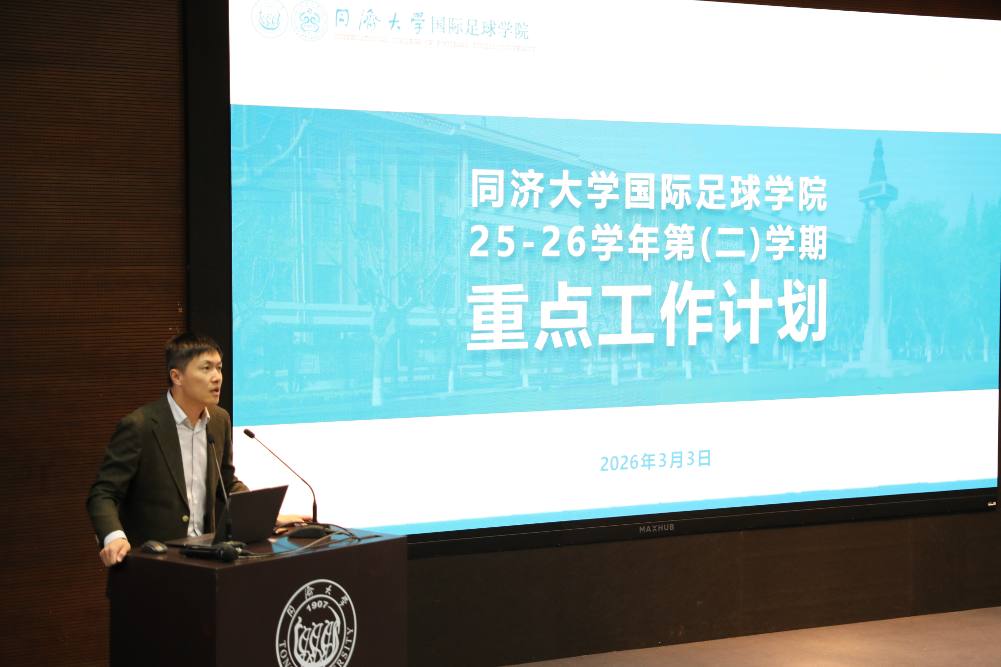 体育部主任卢天凤就2026年体育工作做全面部署,强调2026年是十五五的开局之年,体育部要进一步明确目标、压实责任,推动各项工作高质量落实。带领大家学习《实施大学生体质健康专项行动》通知精神,并强调了“体质强健计划”的紧迫性与重要性,全体教职工要增强育人意识,全员投入,发挥体育在促进师生身心健康、锤炼意志品质、增强集体凝聚力等方面的重要作用,为学校“双一流”建设贡献同济体育的智慧与力量。
