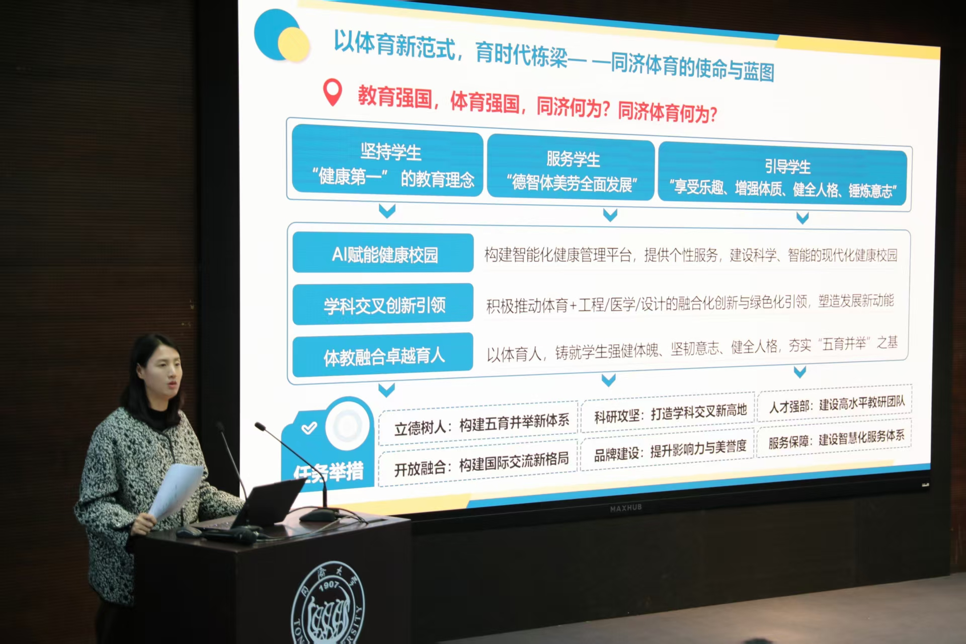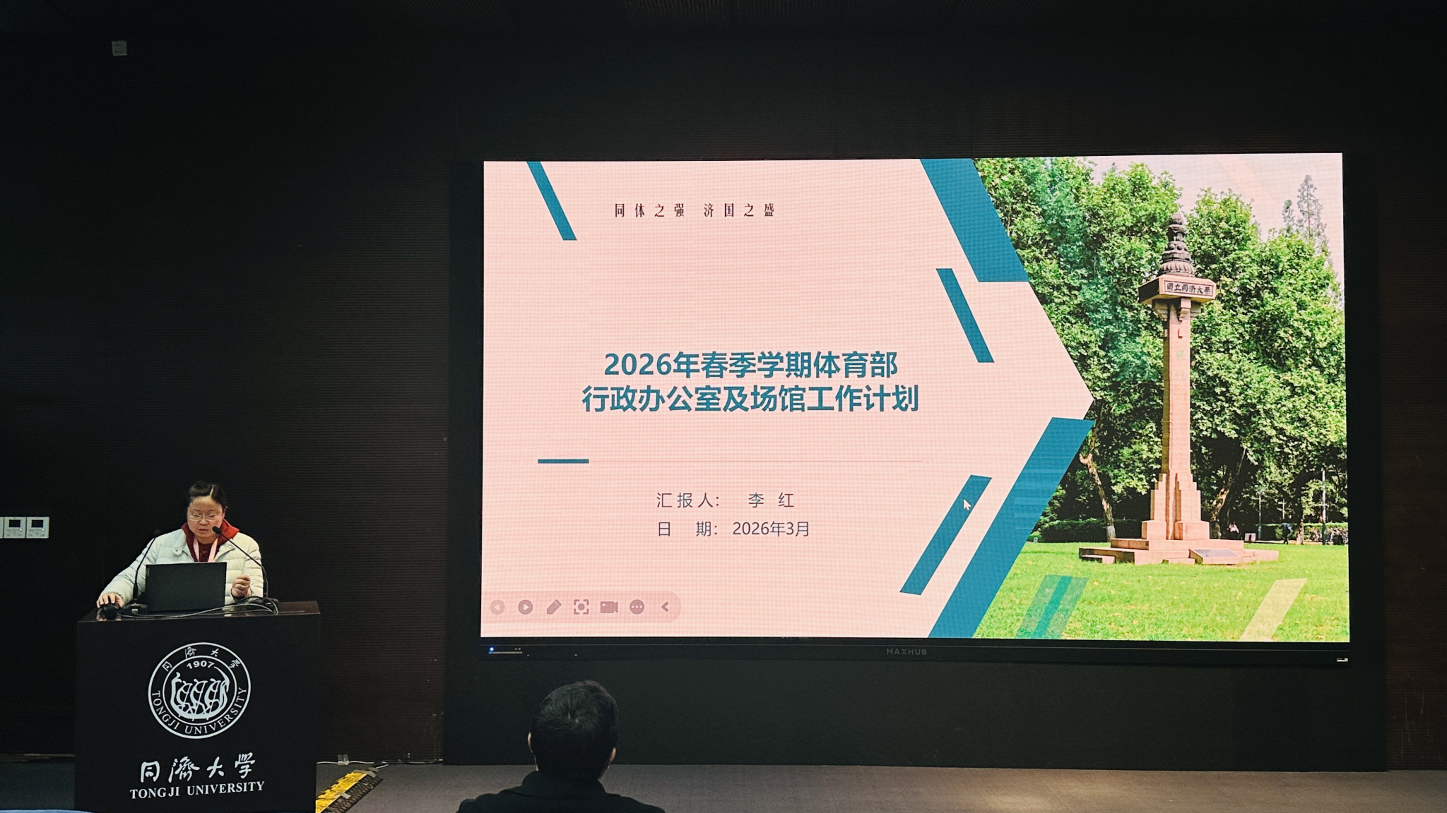 体育部副主任李红通报了场馆保障、安全管理及资产采购等常规工作进展。她指出,开学前场馆安全隐患排查已全部完成,新体育馆主体工程建设基本完工,预计2027年4月竣工并于校庆前投入使用。李红强调要严格规范资产采购流程,厉行节约,并重点推进“群体健康与心理健康有机融合”项目。为迎接120周年校庆,体育部拟开展“同济体育记忆”资料采集、体育盛典、龙舟赛、主题校园跑等系列活动,着力打造“同济百年跃动”校园文化品牌。
